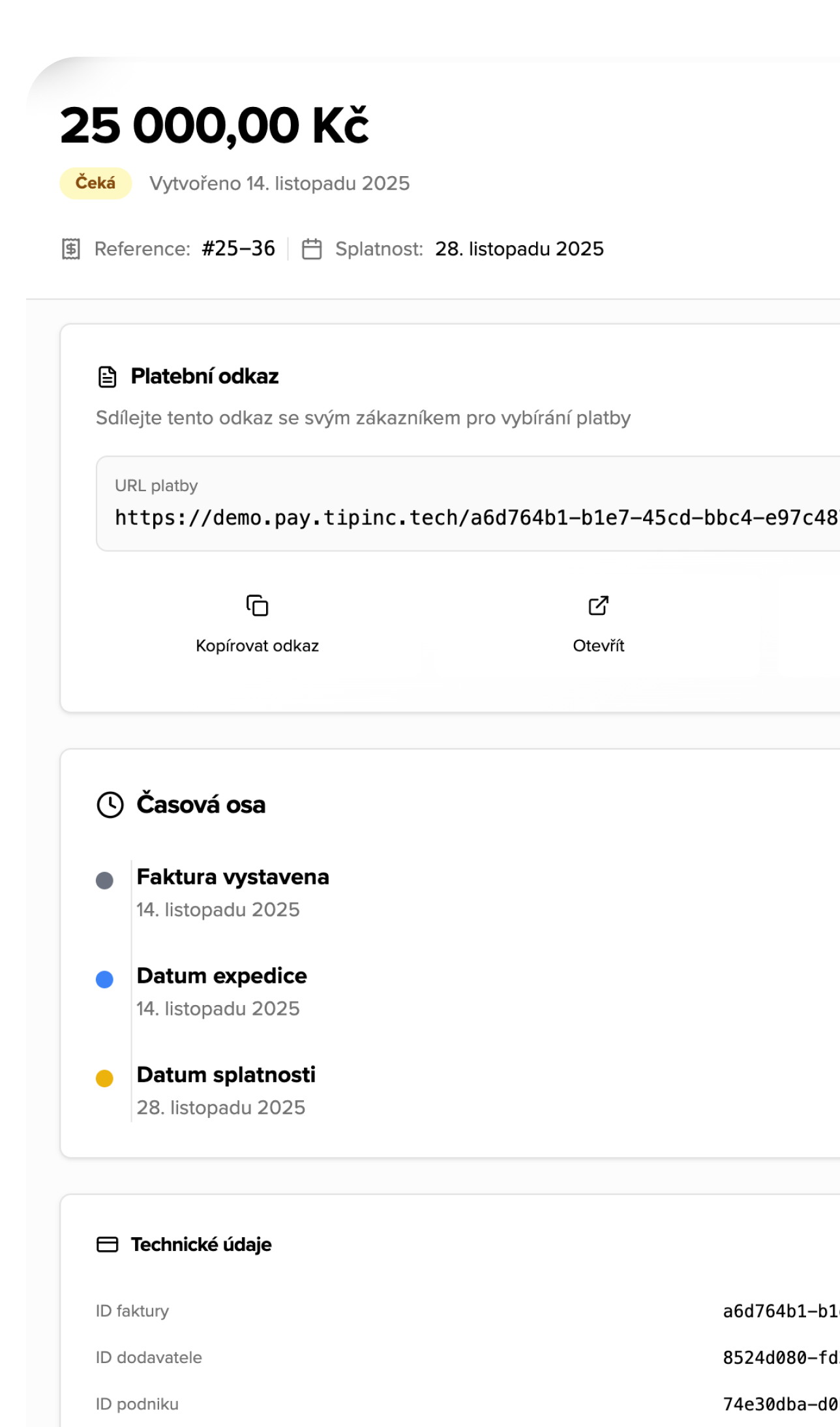 Ano. Uvidíte, kdy byla faktura odeslána, otevřena, kdy byla platba zahájena a dokončena – vše se zároveň v reálném čase synchronizuje zpět do Vašeho systému.