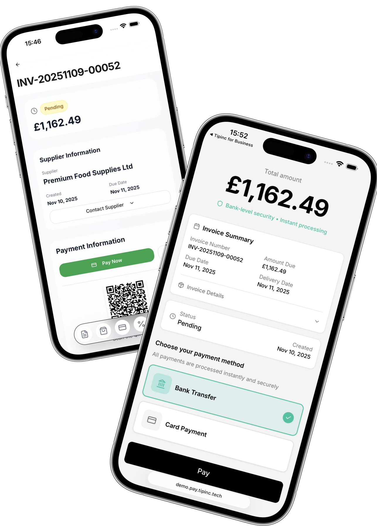 Every invoice leads to a structured, intuitive payment flow. Whether it's bank transfer, saved card, or QR – the experience is built for busy users and designed to convert.